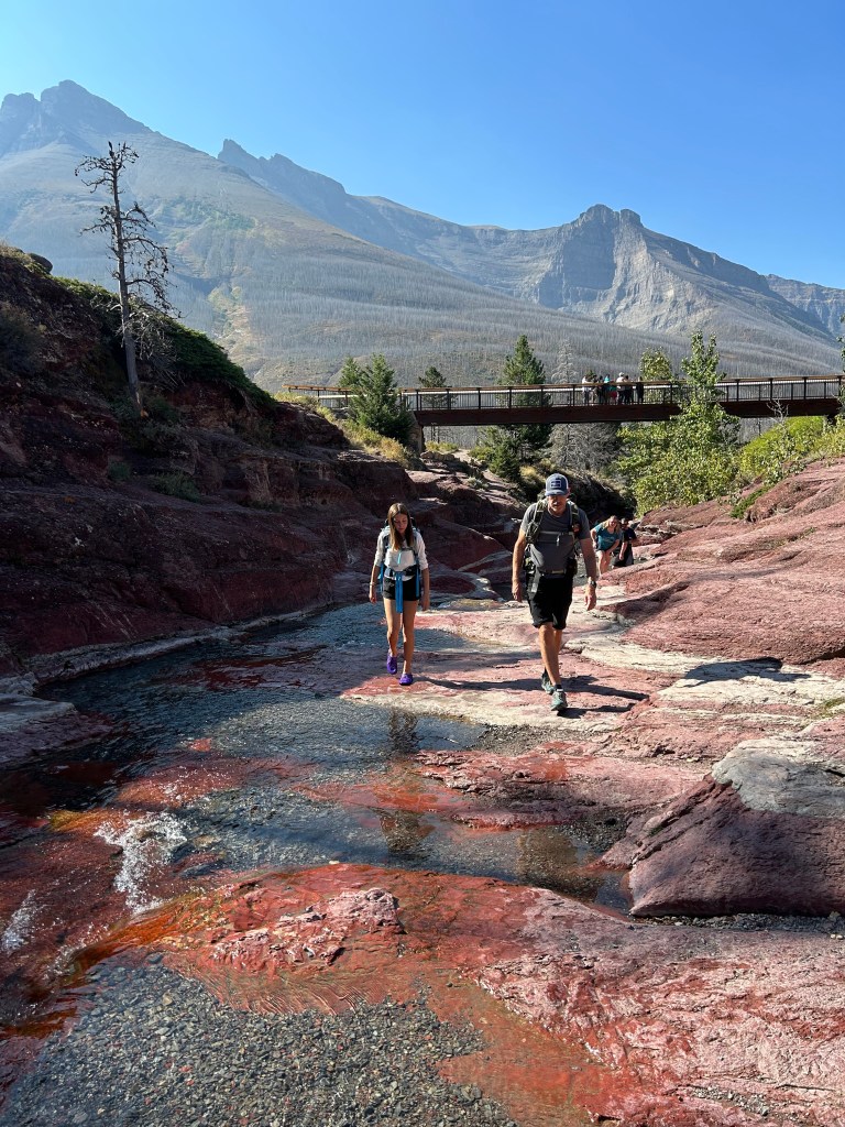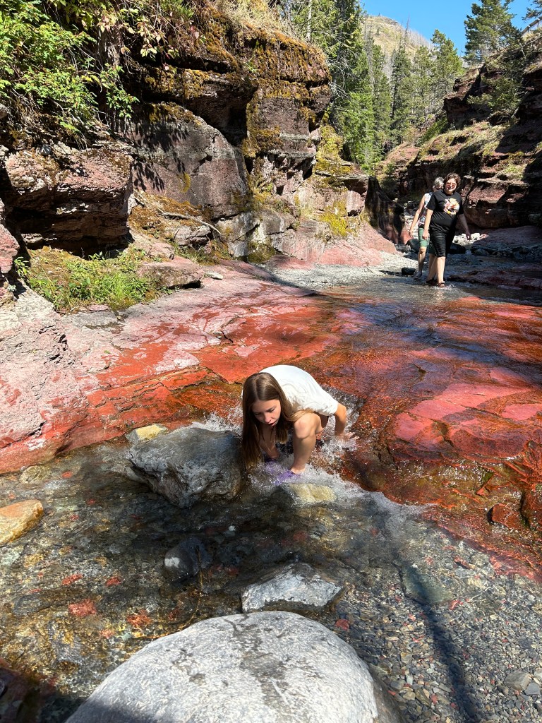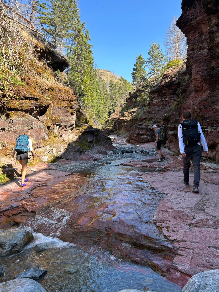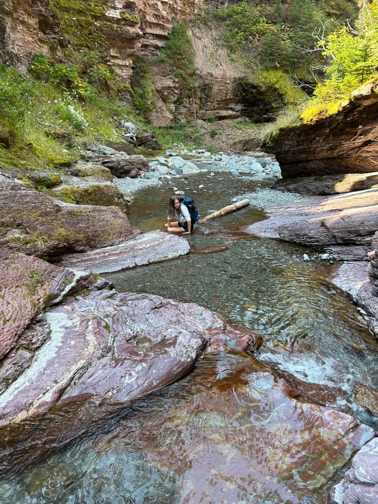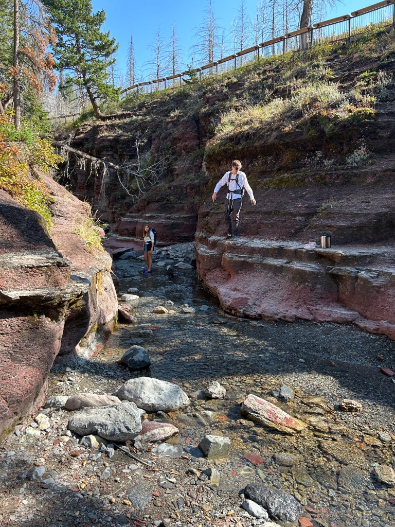 After talking to Evan, our bellhop extraordinaire at Prince of Wales hotel, we decided that instead we would tackle the Red Rock Canyon hike. The official hike is a paved trail around red canyon. But we are too adventurous for that, so we took the route down in the canyon! For the first part of the hike there were families climbing around on the rocks and playing in the water. The air was warm and we were excited to check out the deeper parts of the canyon. The girl and I changed into our water shoes and started in right in the shallow, cold mountain water, while the boys, determined to challenge themselves started out trying to stay dry by climbing and jumping around on exposed rock faces.