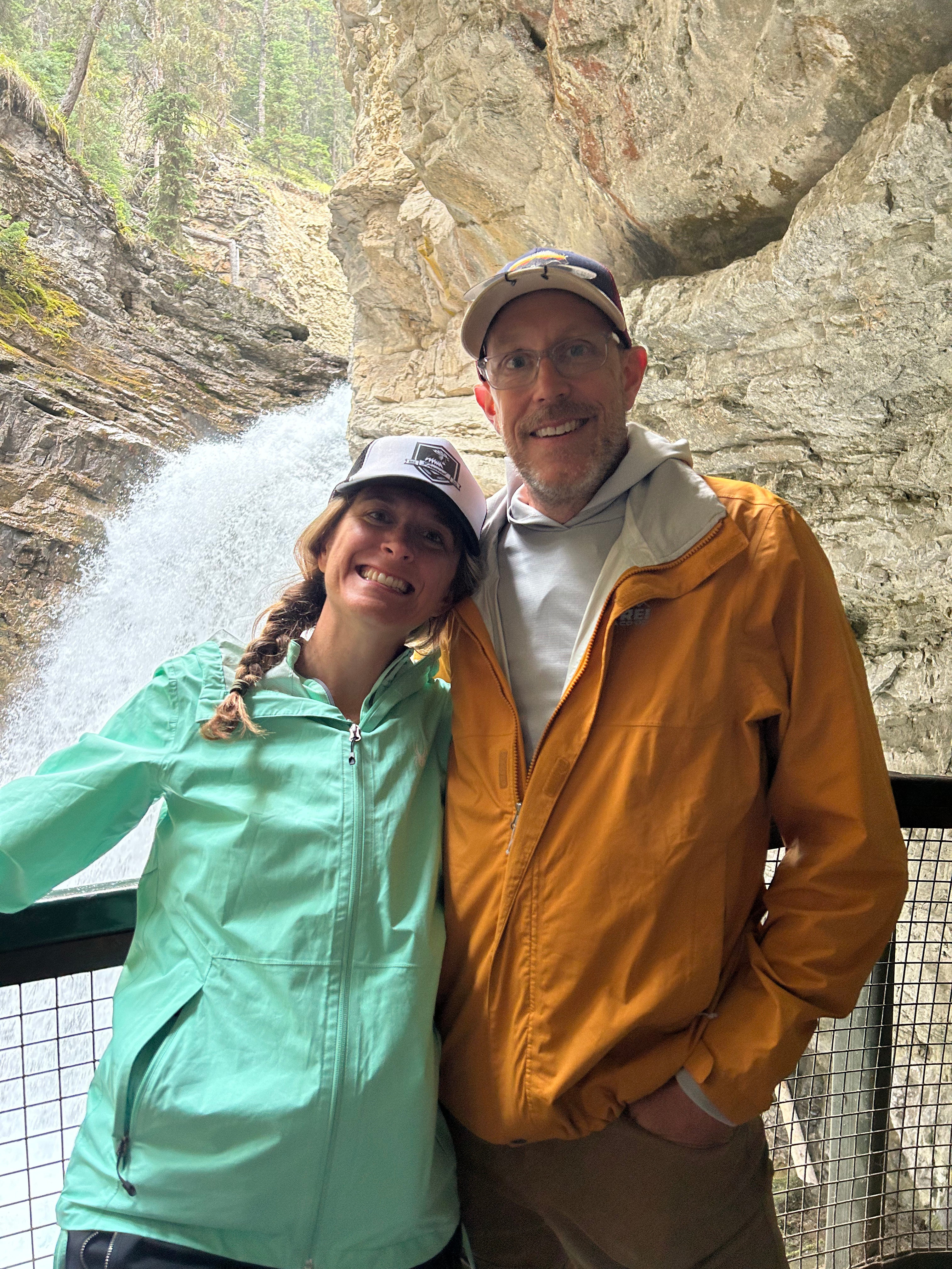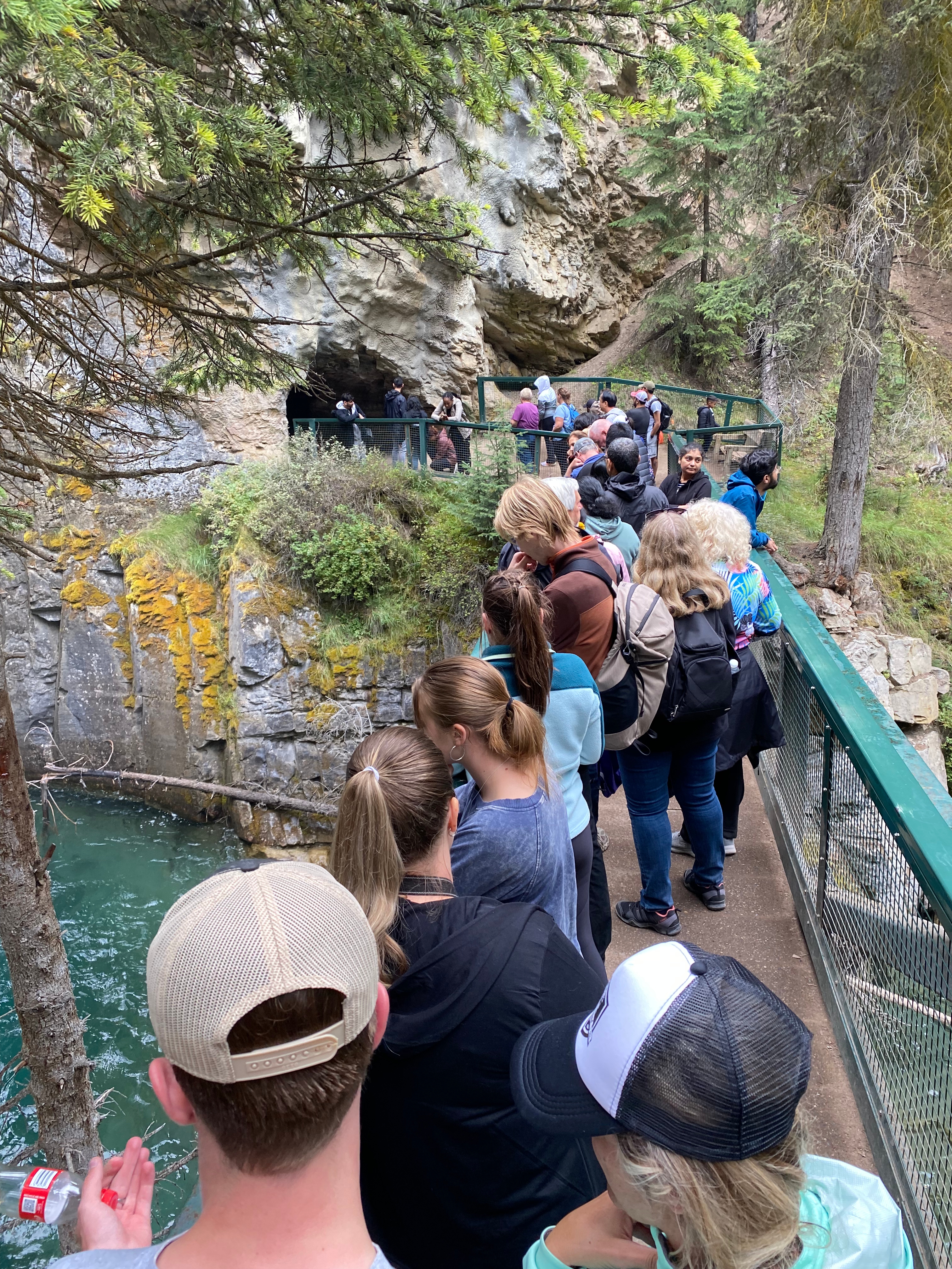 Johnston Canyon is a very popular place, likely because the trail is accessible and paved though still a steady climb in places. The catwalk is set above the creek making for beautiful views all along the way. After following the creek for a ways you come to a small dark cave that you can go into for an up close and personal view of the falls. And I say personal because there was a line to get in allowing visitors to go in one at a time to take photos. The wait didn’t take too long and the cave is fun! We recommend going all the way to upper falls if you can do it!