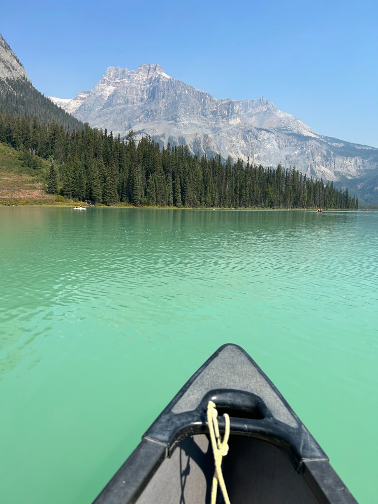 Not much is said about Yoho National Park in all the travel books that I read. But Yoho surprised me and turned out to be home to one of my favorite lakes on this trip. Emerald Lake is just about an hour car ride northwest from downtown Banff. There wasn’t a line for renting a canoe at Boathouse Trading Co., right on the shore, so we paid $100 to rent a canoe for an hour. One hour ended up being just enough time to paddle to the end of the lake and back. The calm turquoise water was beautiful and made for a very enjoyable ride.