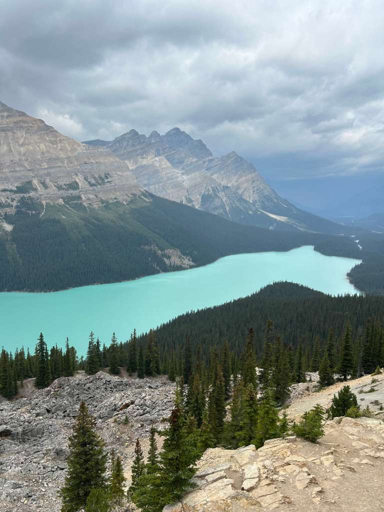 We started with a quick stop (10 min) at Bow Lake where we took just a quick little walk to take in the view. Then we stopped in at Peyto Lake which was so fun to see, the lake is shaped like a wolf’s head. From the car you can get to the viewing point with a short 5 minute walk. We spent a little longer here walking around and taking in the views. Plan for 30 minutes.
